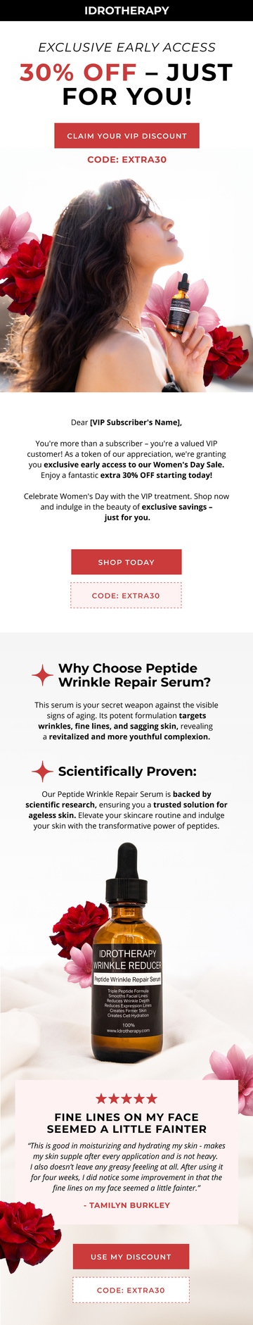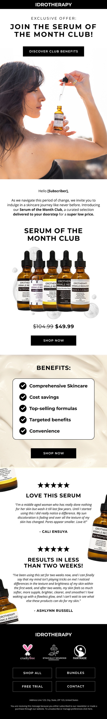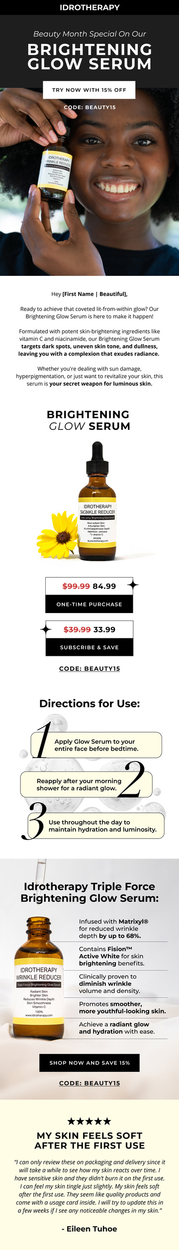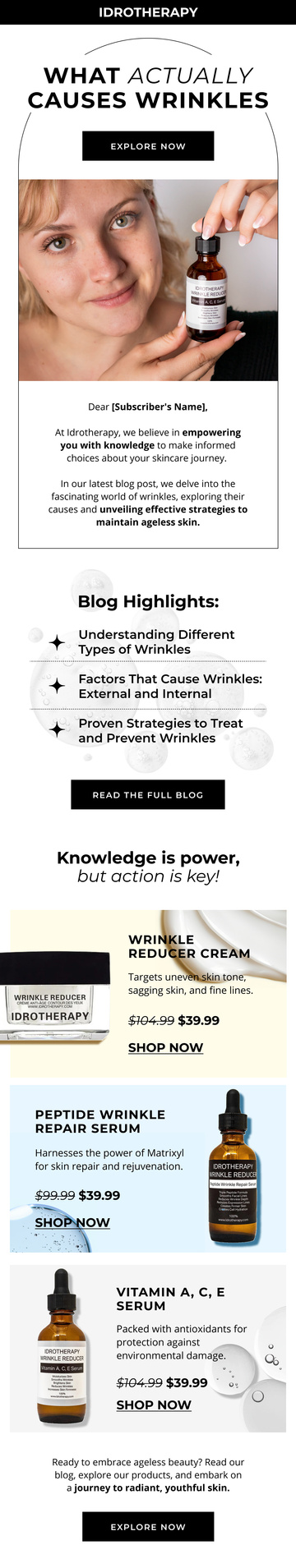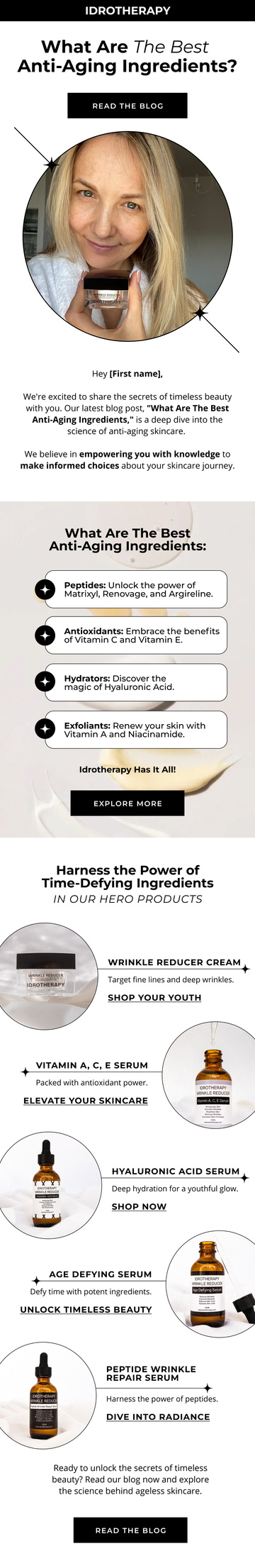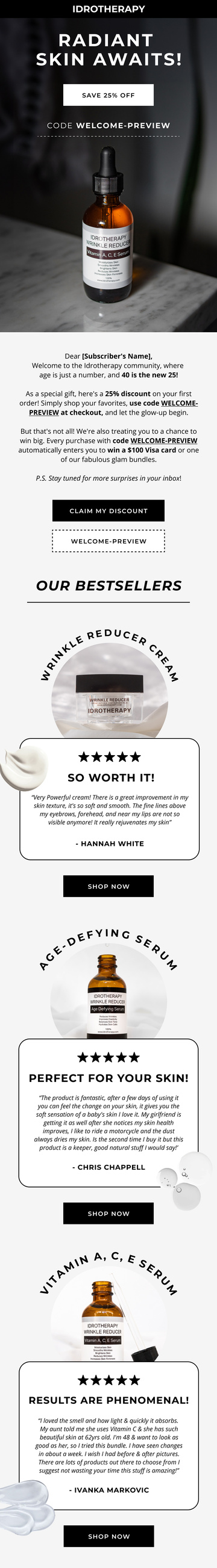 Email campaigns for a skincare brand Idrotherapy. The look and feel of the brand is modern, sleek, clean and luxurious. The products reflect active ingredients which were made the focal point in most emails, targeted to younger Millenials and Gen Z.