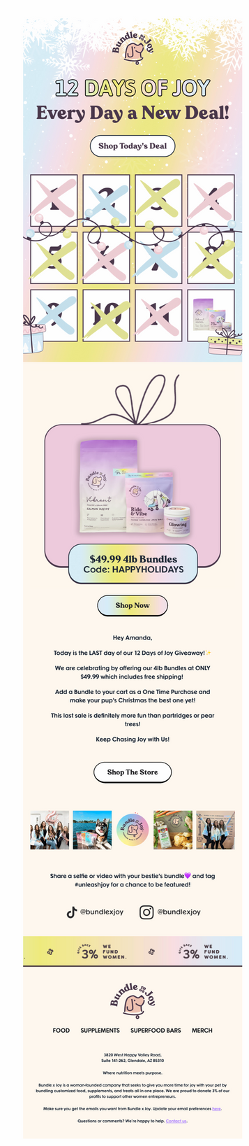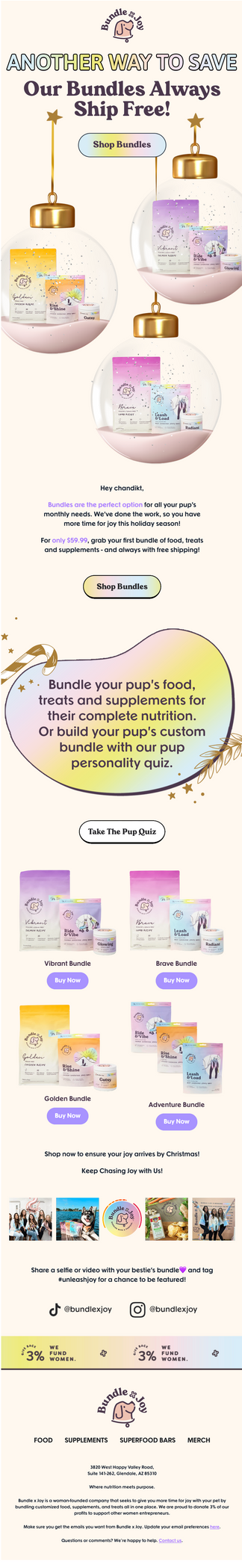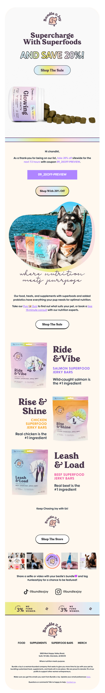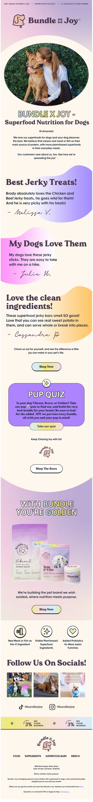The email design for Bundle x Joy highlights their unique brand identity as a seller of superfood for dogs with playful packaging. As the only brand in this field with such branding, it was crucial to showcase what sets them apart and convey their fun personality through the email.