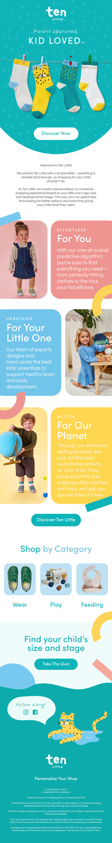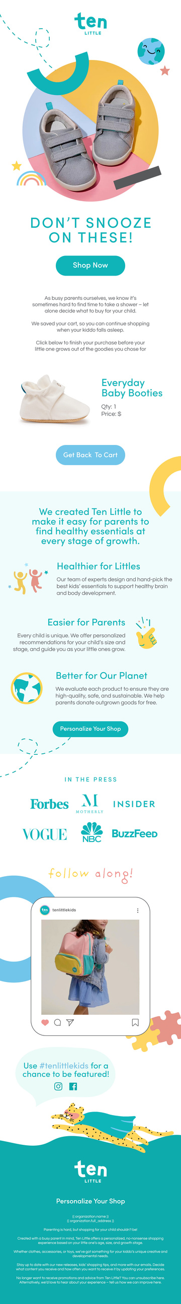 For this email design concept I emphasized their unique product offerings and incorporated fun design elements to create a template that appeals to parents who prioritize sustainability and style for their children's footwear and other toys.
