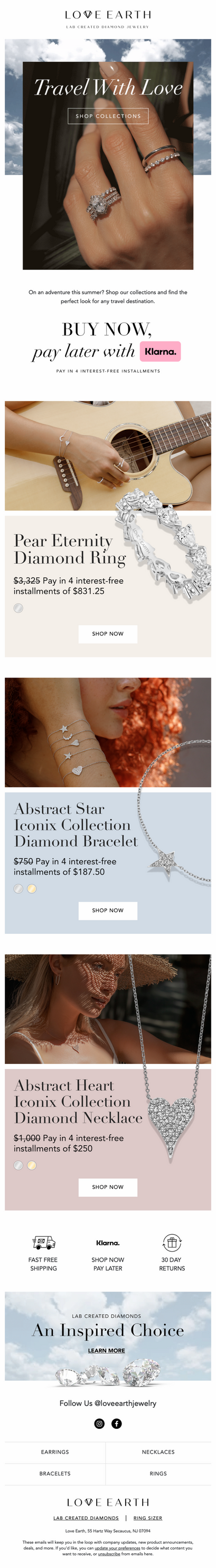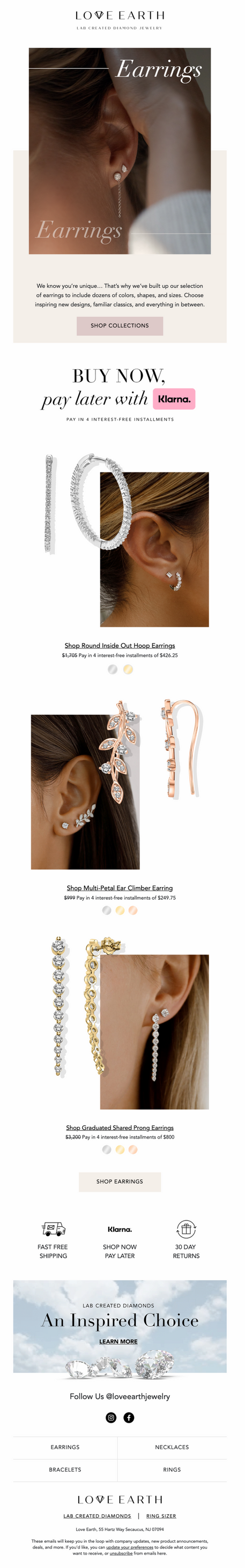 This email design for Love Earth showcases their sustainable and ethical jewelry, highlighting their elegant designs and earthy color tones. I aimed to create an email that captures the brand's values and appeals to customers who prioritize sustainability and ethical practices in their jewelry choices.