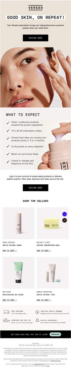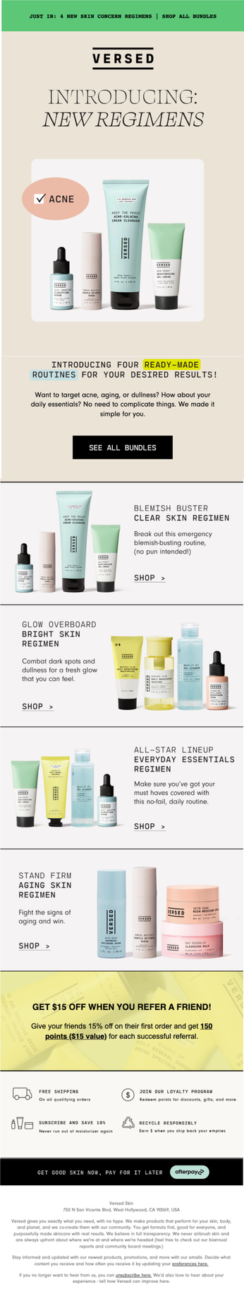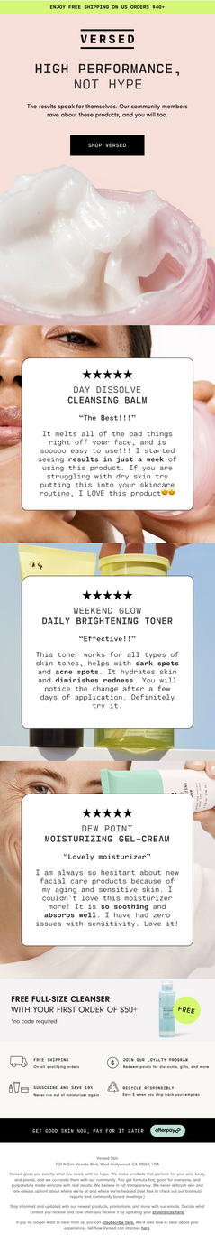 The email design for Versed Skin reflects the brand's commitment to clean and sustainable beauty products. Versed Skin offers a wide range of skincare products that are affordable, eco-friendly, and free of harmful chemicals. It was important to convey these values through the email while also highlighting their unique product line. By showcasing their clean and simple packaging and incorporating their brand colors and typography, we aimed to create an email that captures the essence of the brand and resonates with their target audience.